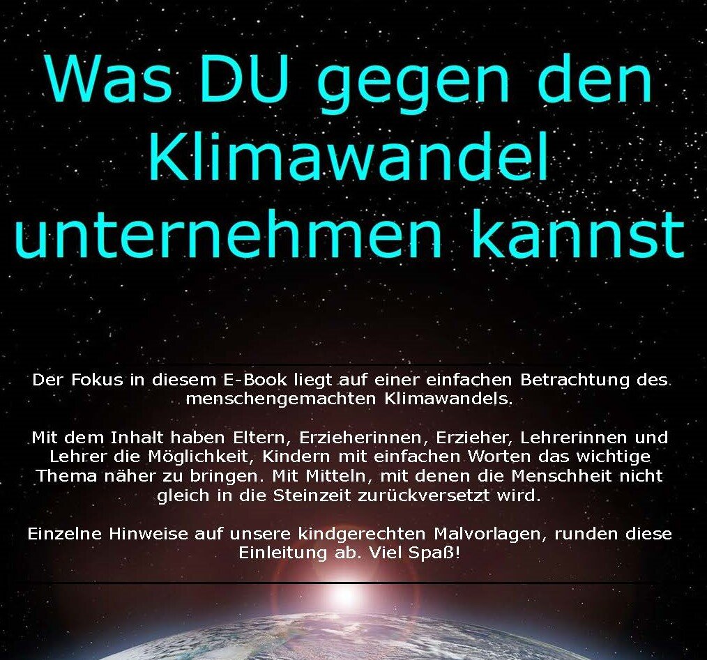 Der Fokus in diesem E-Book liegt auf einer einfachen Betrachtung des menschengemachten Klimawandels. Mit dem Inhalt haben Eltern, Erzieherinnen, Erzieher, Lehrerinnen und Lehrer die Möglichkeit, Kindern mit einfachen Worten das wichtige Thema näher zu bringen. Mit Mitteln, mit denen die Menschheit nicht gleich in die Steinzeit zurückversetzt wird. Einzelne Hinweise auf unsere kindgerechten Malvorlagen, runden diese Einleitung ab. Ein Klick auf die Grafik öffnet das kostenlose Ebook zum Download: