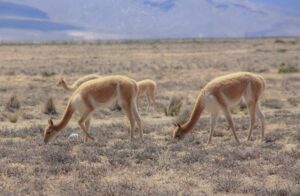 Vikunjas besitzen ein extrem feines, dichtes Fell, das als eine der edelsten und teuersten Naturfasern weltweit gilt und sie vor Kälte schützt. Sie leben in kleinen Familiengruppen, bestehend aus einem Männchen, mehreren Weibchen und deren Jungtieren, und verteidigen ihr Territorium energisch gegen Eindringlinge. Vikunjas ernähren sich von kurzen, nährstoffarmen Gräsern und Kräutern, die sie mit ihren weichen Lippen effizient abweiden, und sind auf die spärliche Vegetation der Hochlandsteppen angewiesen. Sie sind sehr scheu, reagieren auf Störungen mit hoher Fluchtbereitschaft und können große Strecken zurücklegen.