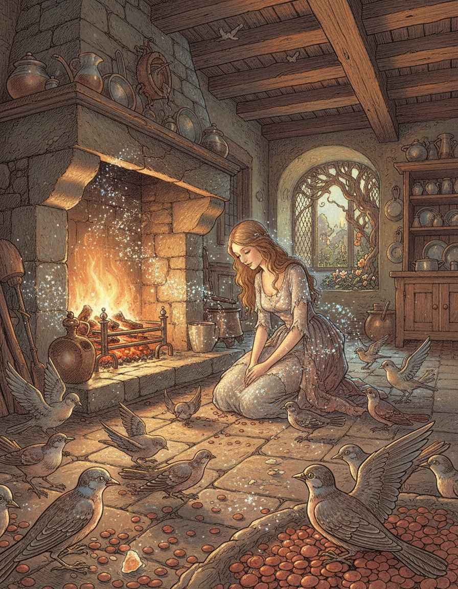 Da kamen zum Küchenfenster zwei weiße Täubchen herein, und danach die Turteltäubchen, und endlich schwirrten und schwärmten alle Vöglein unter dem Himmel herein und ließen sich um die Asche nieder. Und die Täubchen nickten mit den Köpfchen und fingen an pick, pick, pick, pick, und da fingen die übrigen auch an pick, pick, pick, pick, und lasen alle guten Körnlein in die Schüssel. Kaum war eine Stunde herum, so waren sie schon fertig und flogen alle wieder hinaus.