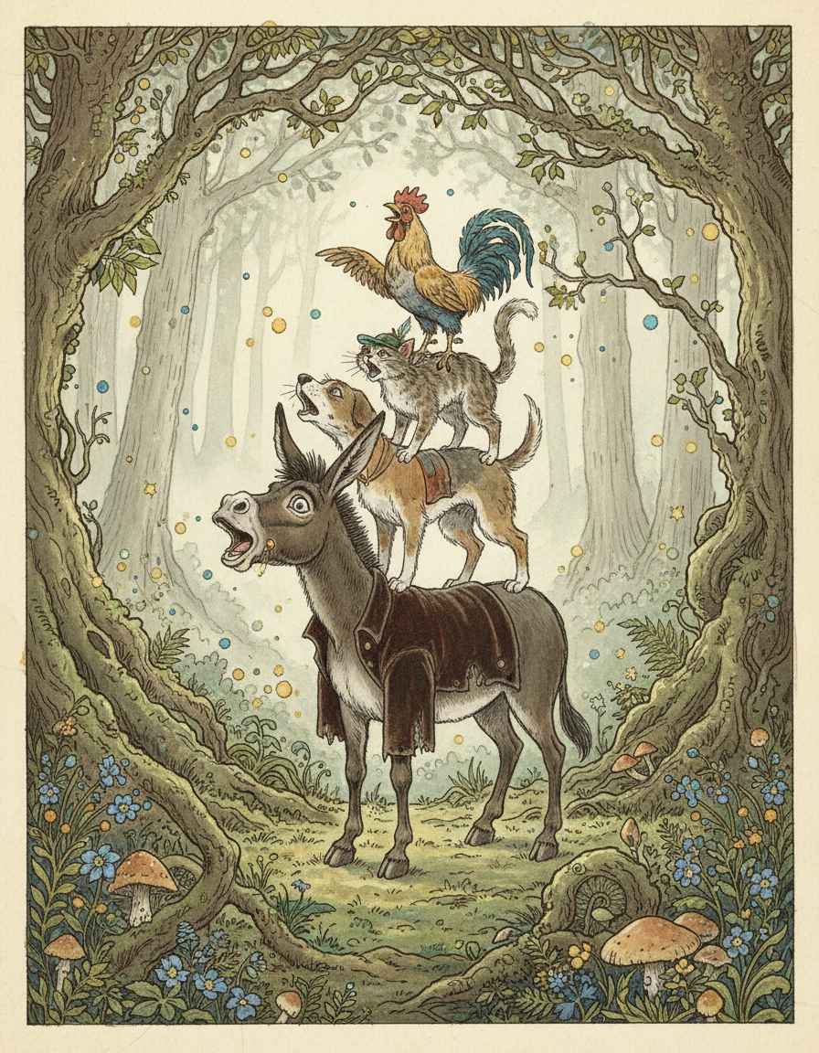 Da ratschlagten die Tiere, wie sie es anfangen müssten, um die Räuber hinauszujagen, und fanden endlich ein Mittel. Der Esel musste sich mit den Vorderfüßen auf das Fenster stellen, der Hund auf des Esels Rücken springen, die Katze auf den Hund klettern, und endlich flog der Hahn hinauf und setzte sich der Katze auf den Kopf.