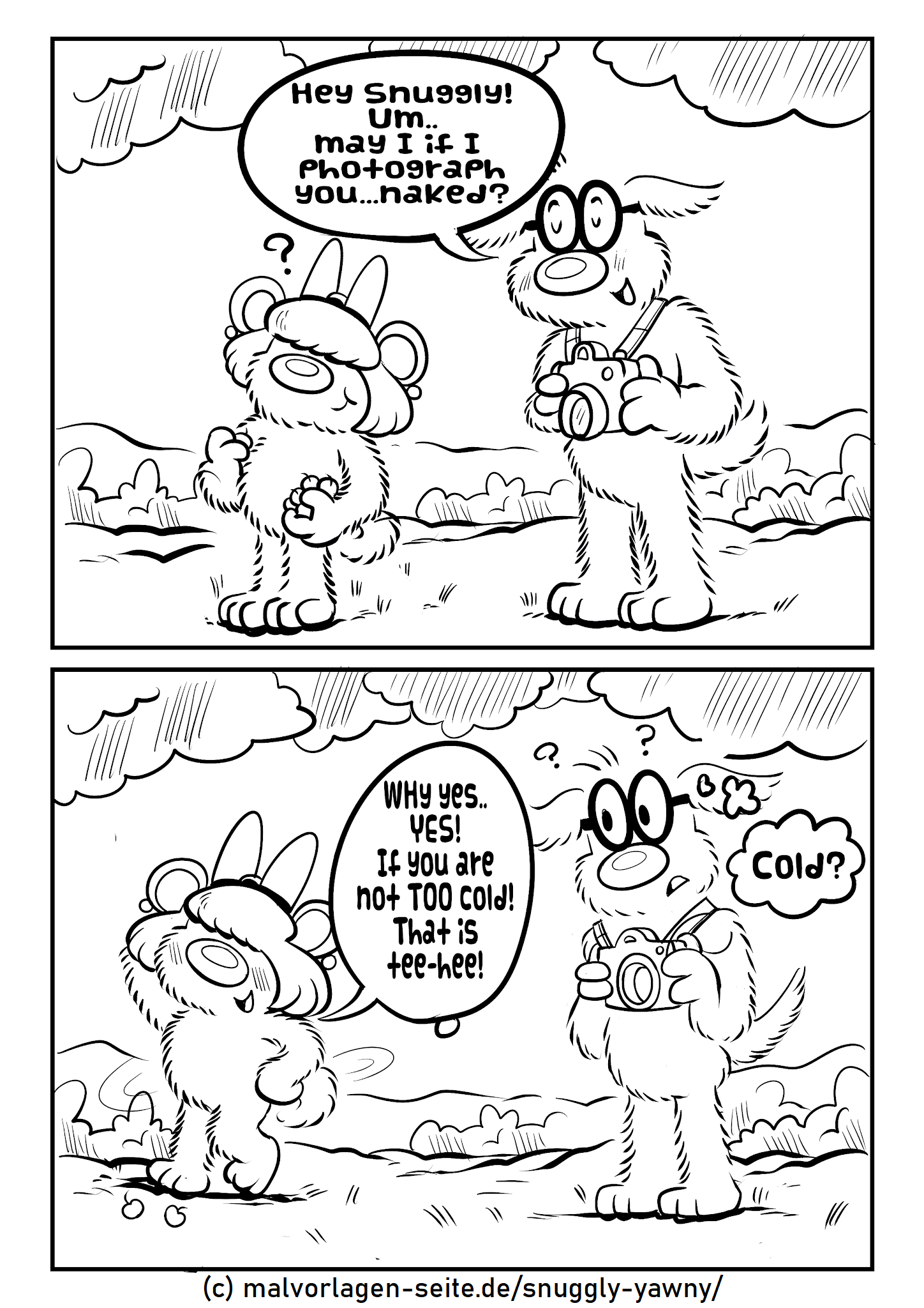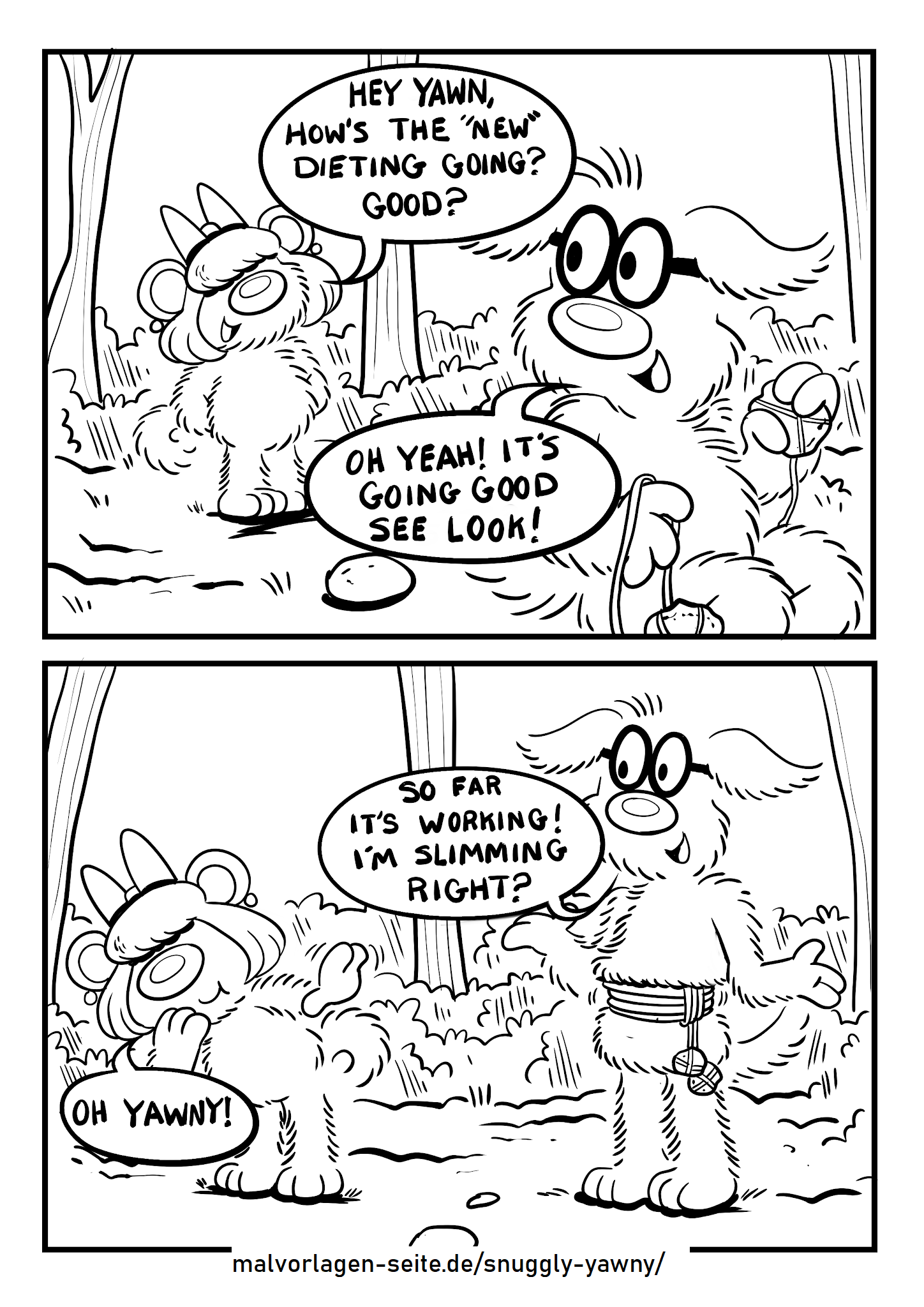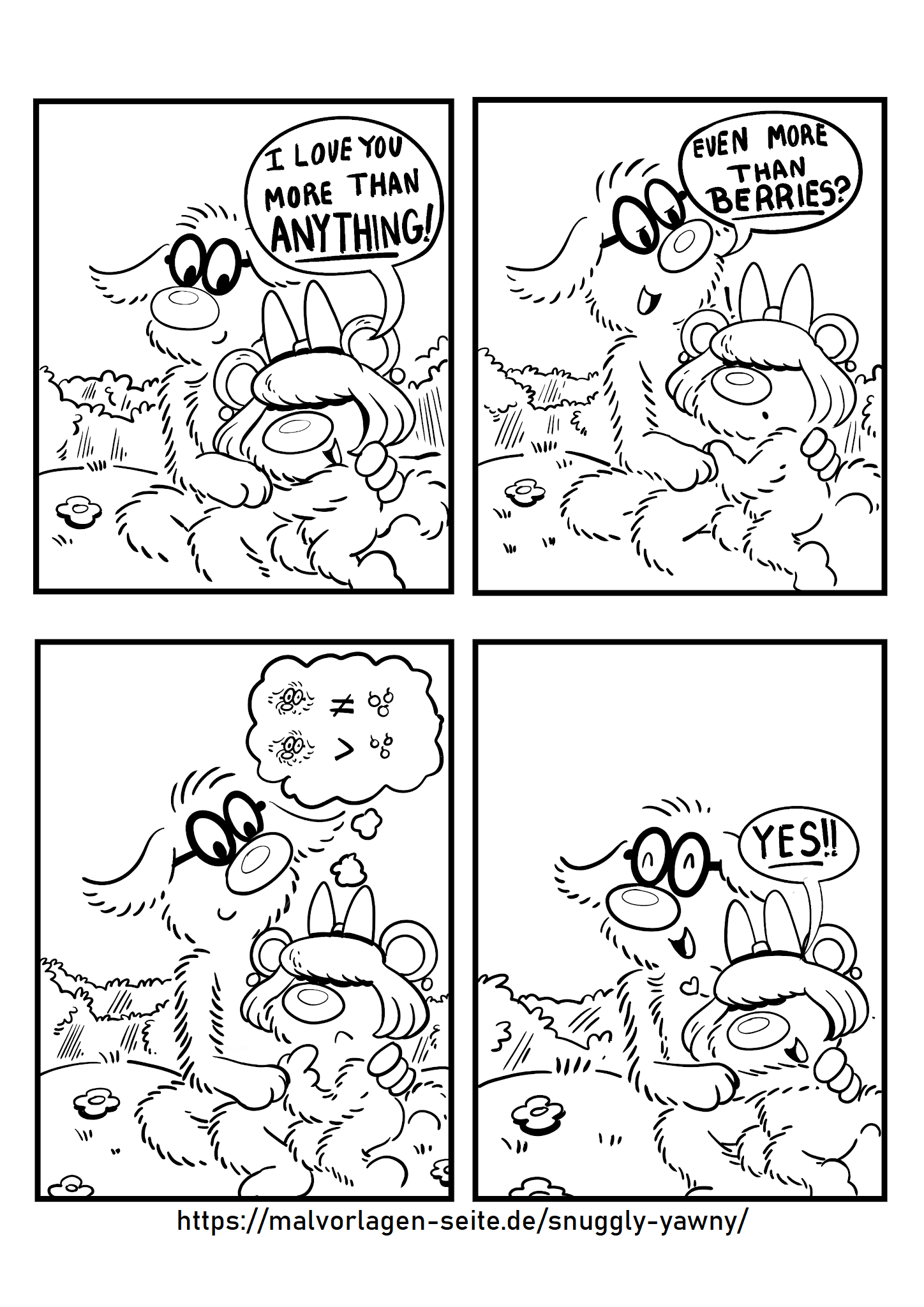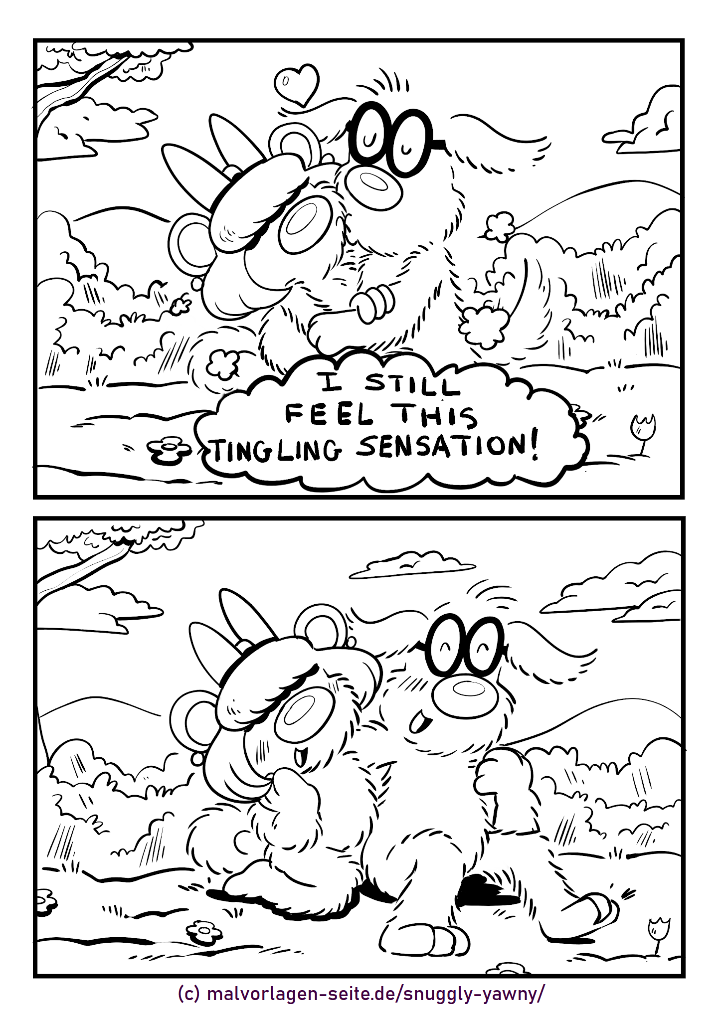 Auf unserer Seite findest du tolle Zeichnungen von Snuggly und Yawny, die die lustigsten Momente ihrer Abenteuer festhalten! Wir laden dich herzlich ein, sie herunterzuladen und mit ihnen zu lachen, zu kuscheln und die kleinen Freuden des Lebens zu feiern. Denn bei Snuggly und Yawny ist immer Platz für ein wenig mehr Liebe, Spaß und vor allem, für die besten Freunde!